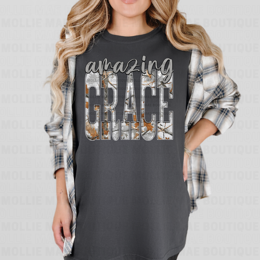 Carry your faith with style in the Amazing Grace Grey Camo Tee, a bold yet meaningful design that pairs timeless camo with heartfelt words. Featuring oversized block letters filled with a soft grey camo pattern, this tee keeps your look effortlessly casual while sharing an inspiring message of grace.