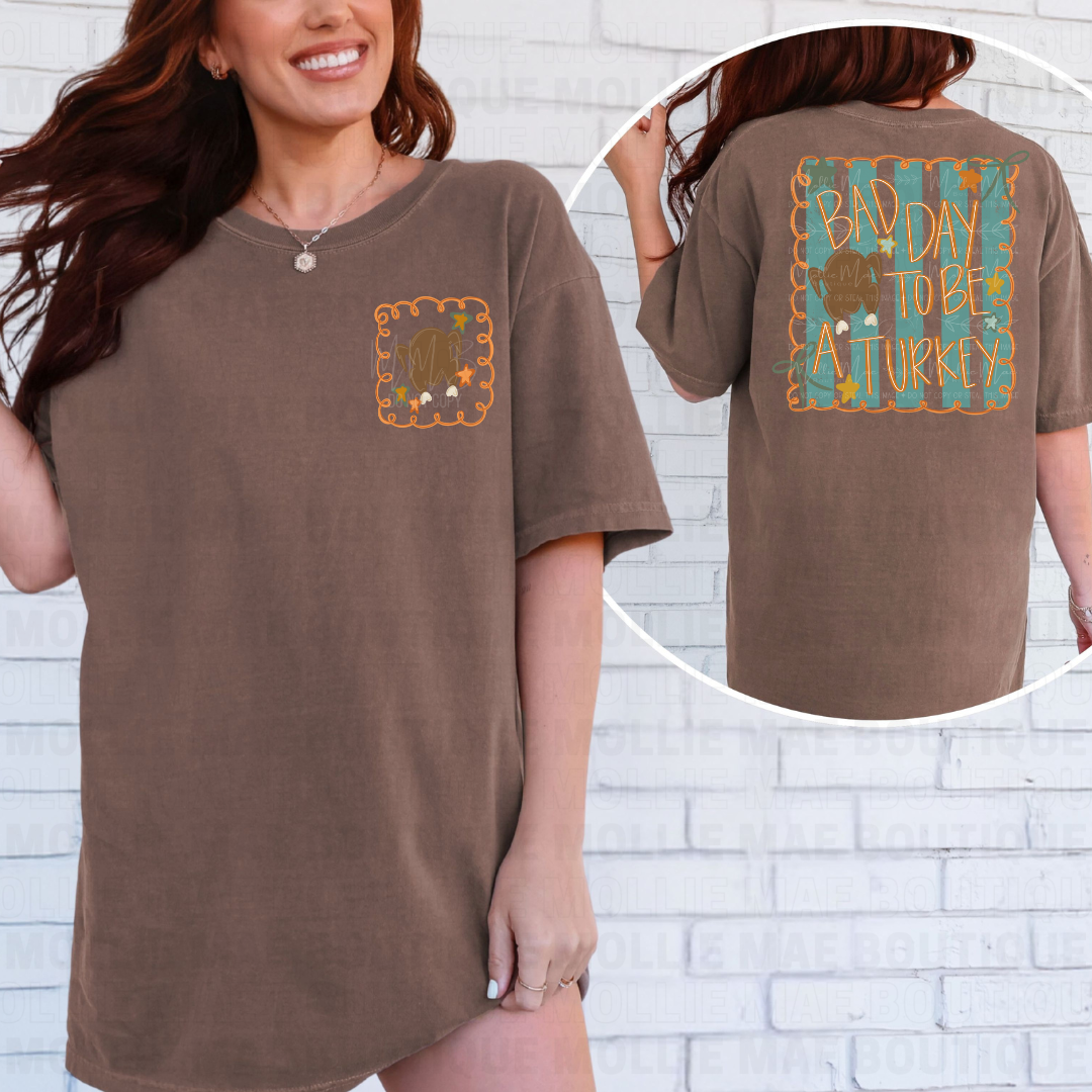 Bring humor to your Thanksgiving style with our Bad Day To Be A Turkey graphic tee! This playful design features a bold back print with whimsical lettering and a matching pocket detail on the front. Printed on a Comfort Colors Espresso tee, it’s ultra-soft, vintage-washed, and perfect for fall festivities.