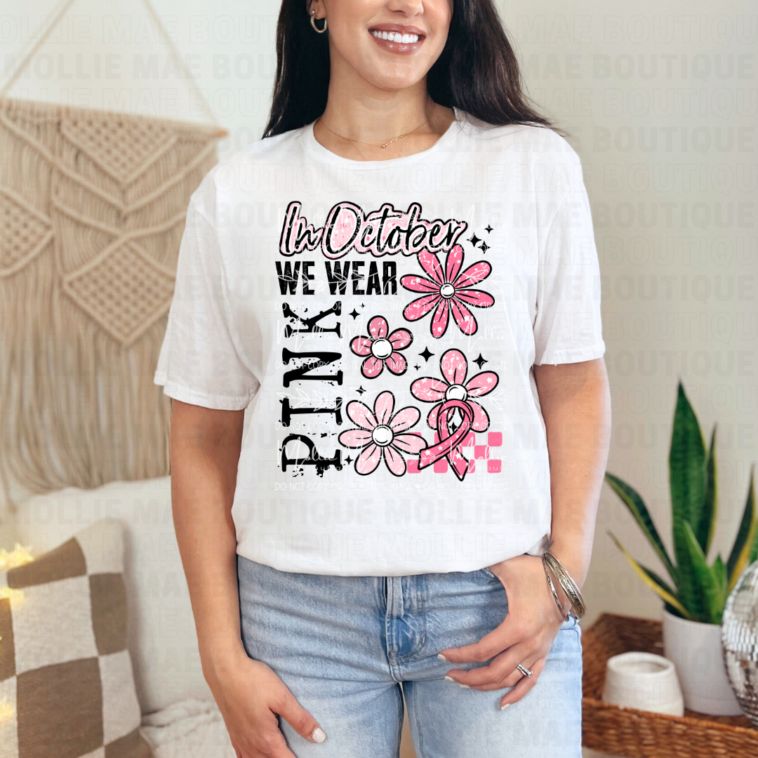 Show your support in style with our In October We Wear Pink Graphic Tee, designed with bold florals and the iconic pink ribbon to honor Breast Cancer Awareness Month. Printed on a classic white Gildan tee, this piece pairs perfectly with jeans, joggers, or layered under your favorite cardigan.