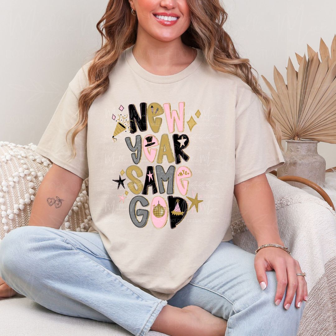 Celebrate the new year with a message that never goes out of style. Our New Year, Same God graphic comes printed on your choice of a cozy Gildan sweatshirt or a classic unisex tee — both in the perfect soft sand shade with playful pink + gold accents that make the design pop.