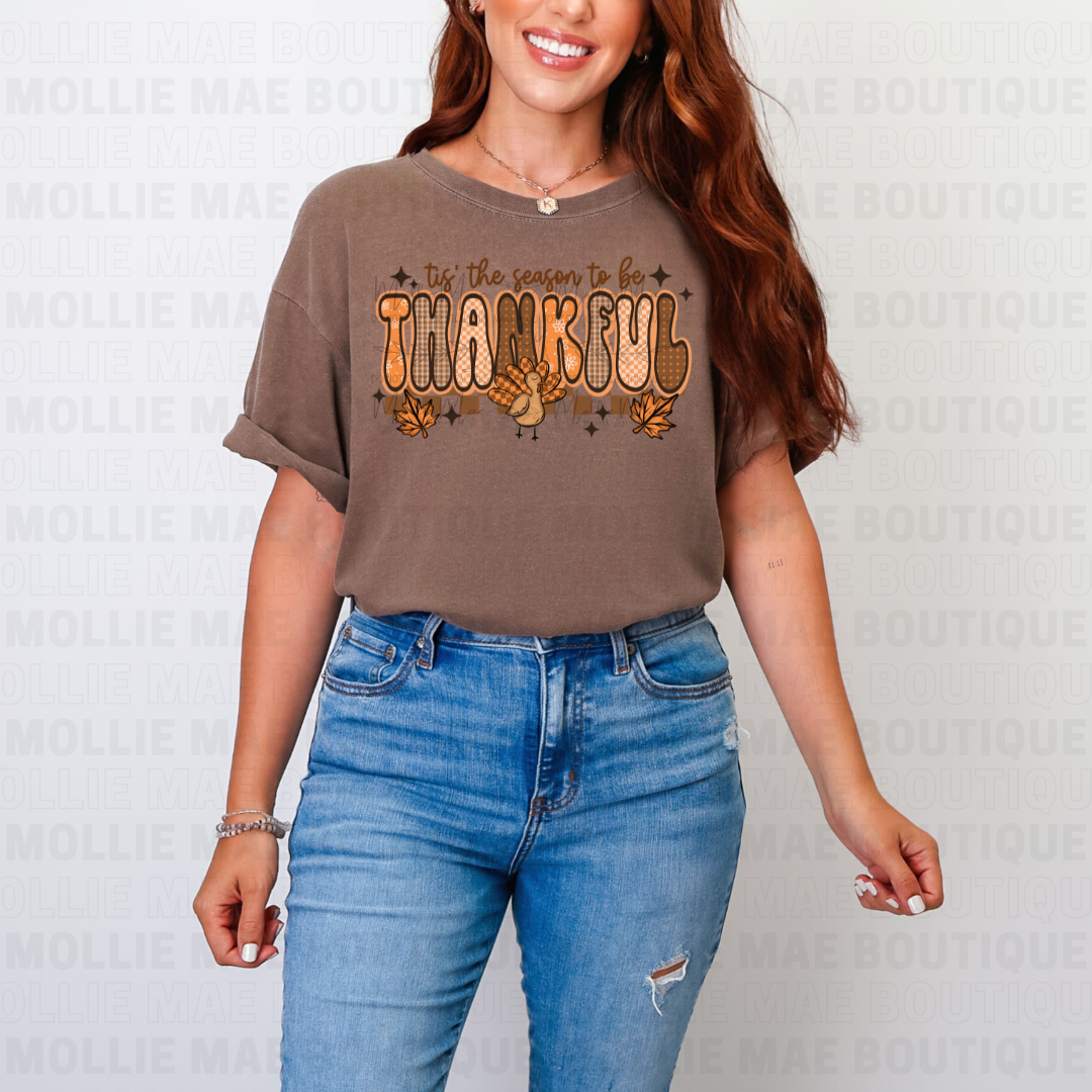 Celebrate the season of gratitude in style with our Turkey Time Thankful Tee. Featuring playful retro-inspired lettering that reads “’Tis the Season to be Thankful”, this graphic tee is complete with a cheerful turkey, autumn leaves, and whimsical fall details. Printed on a soft Comfort Colors Espresso tee, it’s the perfect mix of cozy comfort and festive flair.